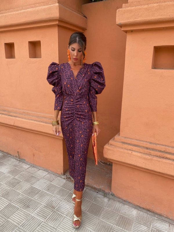 With a very flattering cut, this midi dress features a crossover V-neckline and maxi puff sleeves that create a very attractive visual contrast. Its front gathering enhances the figure, while the original floral print in purple and orange tones gives it a unique and vibrant style.