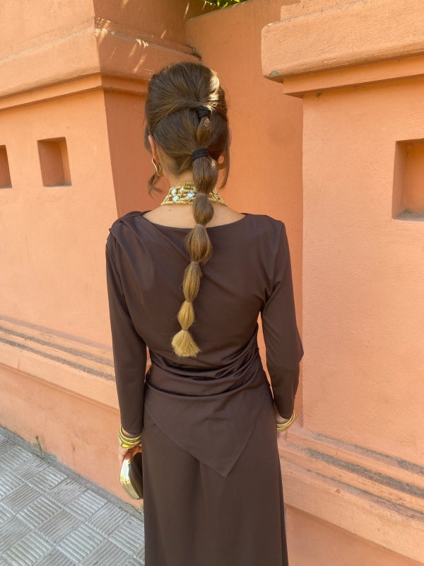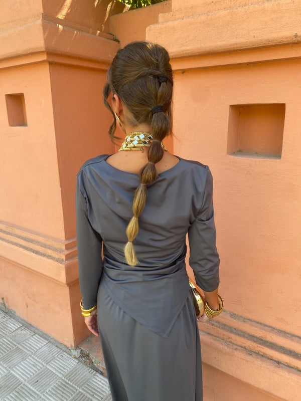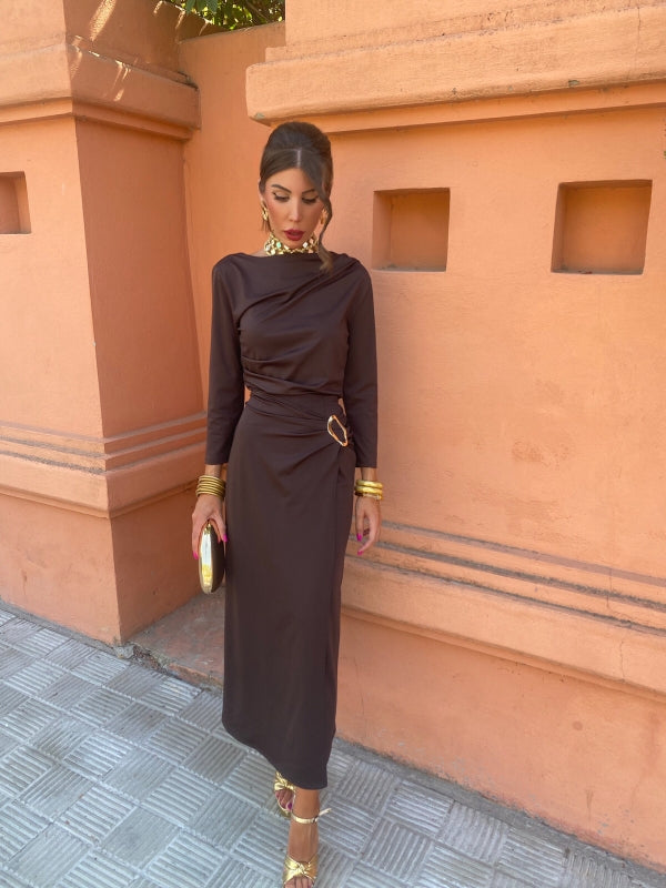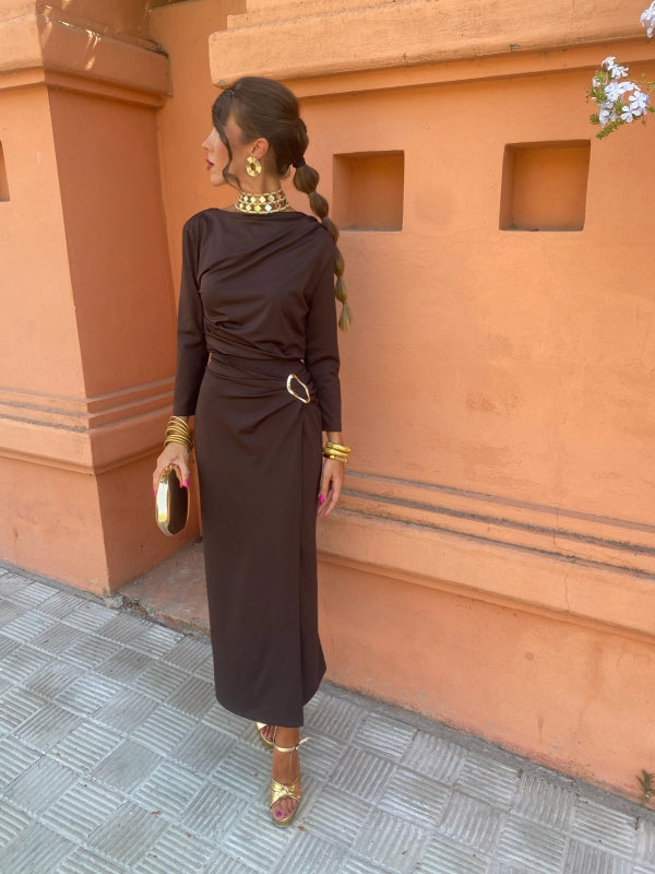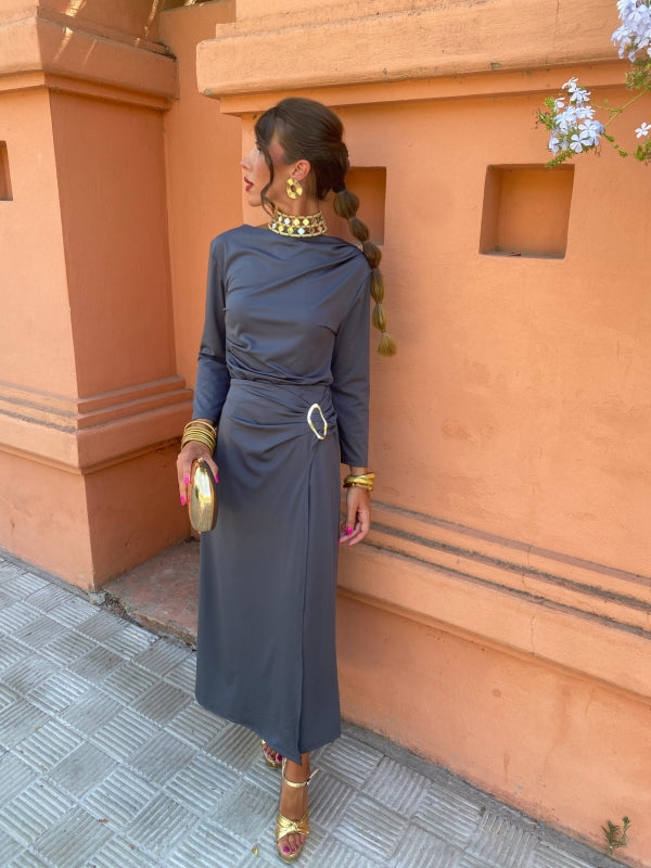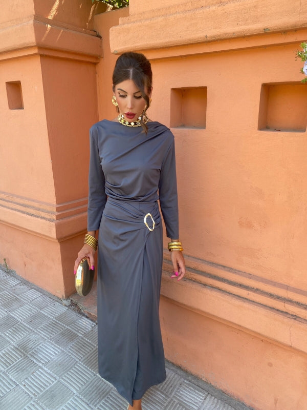 The ruched silhouette, gold detail, and side slit create a sophisticated look that’s both flattering and comfortable.