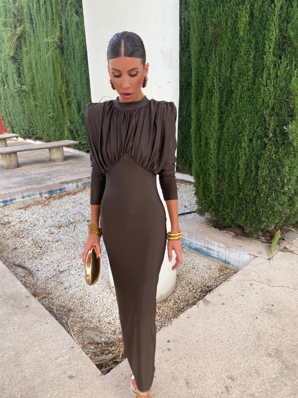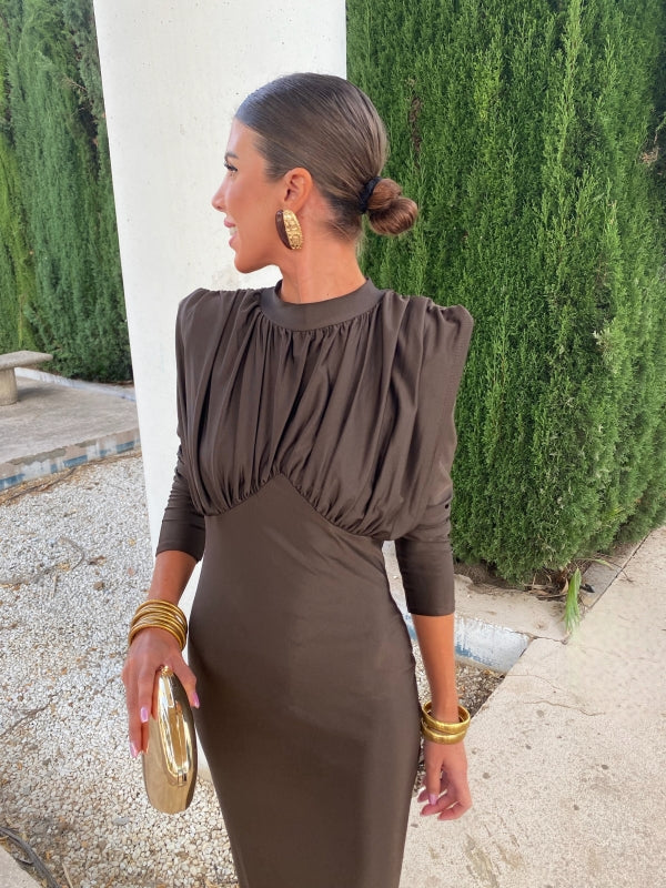 Its long sleeves and structured shoulders design acquires a more natural and sophisticated air in this color, while the opening in the back keeps the sensual touch. The main attraction of this guest dress is its innovative neckline, designed with a flattering draping that enhances the silhouette.