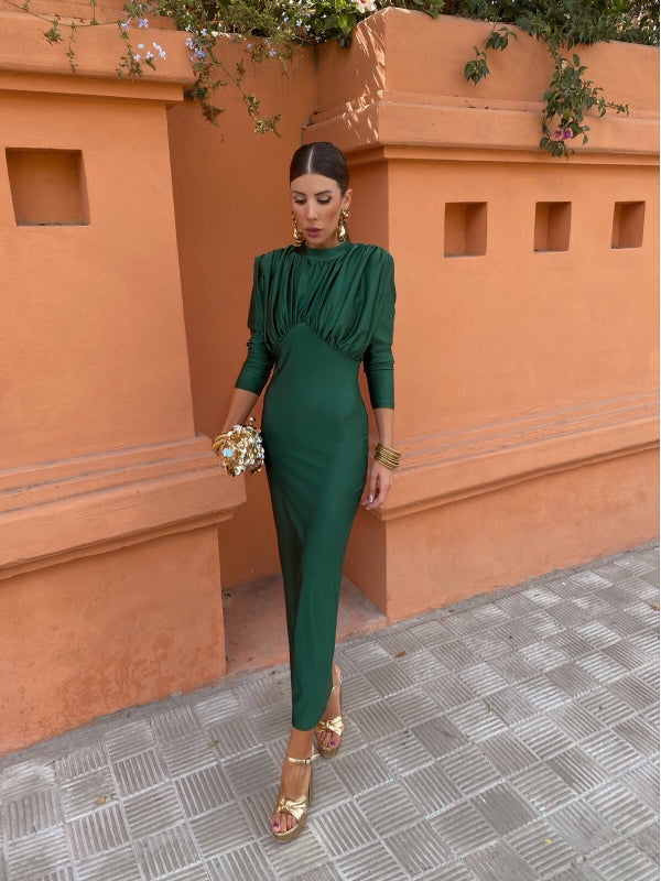 This guest dress, with its long-sleeved design, pronounced shoulders and back slit, takes on a new dimension in a vibrant shade of green. Its color, reminiscent of a bright emerald, is perfect for highlighting any celebration and brings a sophisticated freshness to the design.