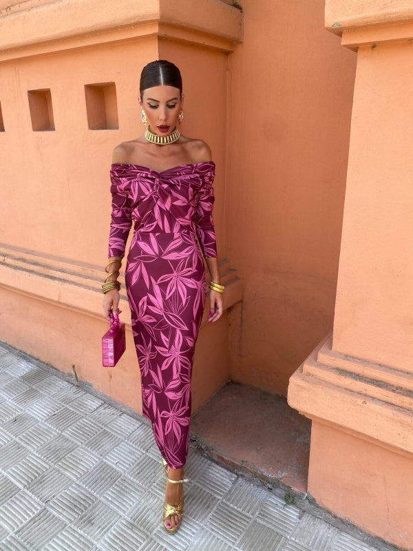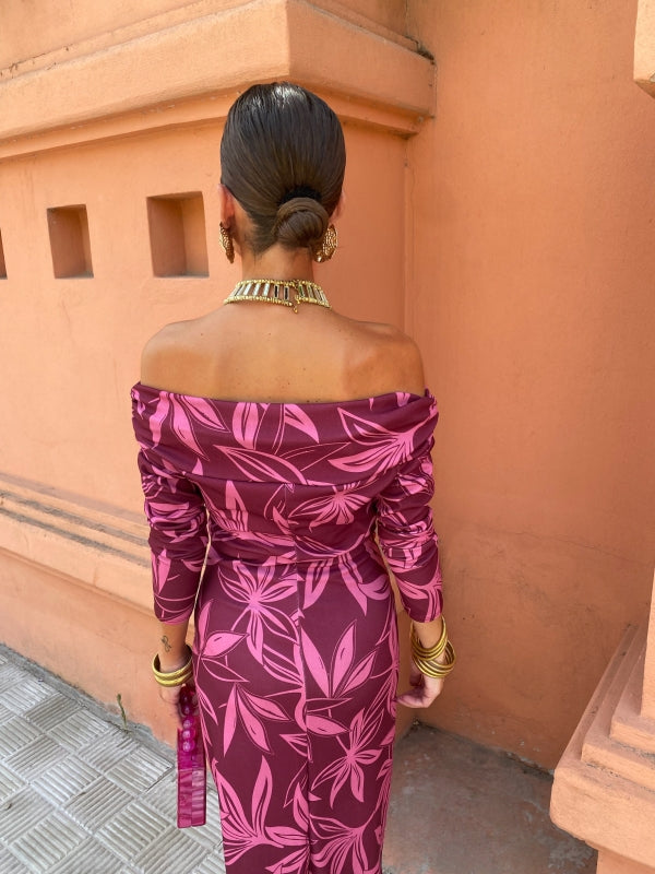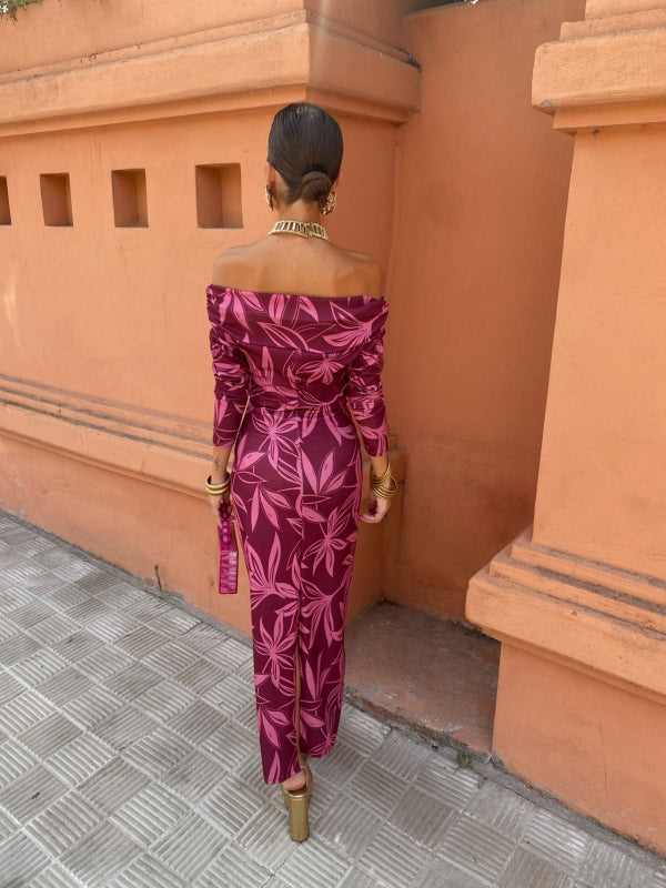 Combine romance and elegance with the Nuria Rose Dress. Its long, fitted cut highlights the silhouette, while its pink floral print on a burgundy background creates a refined contrast. Perfect for special events and elegant dinners.